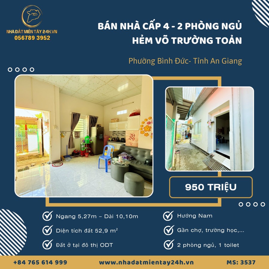 🏡 BÁN NHÀ CẤP 4 - 2 PHÒNG NGỦ - HẺM VÕ TRƯỜNG TOẢN, BÌNH ĐỨC, AN GIANG (MS: 3537) 🏡
