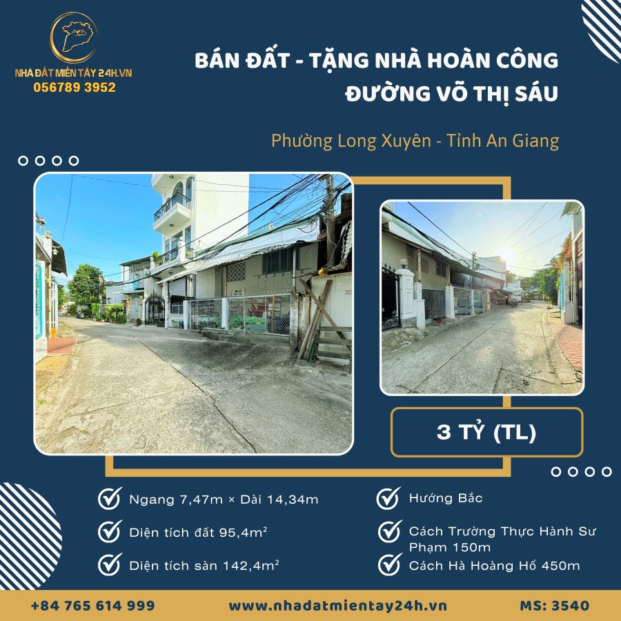 🌟 BÁN ĐẤT TẶNG NHÀ ĐÃ HOÀN CÔNG – ĐƯỜNG VÕ THỊ SÁU, GẦN TRƯỜNG ĐẠI HỌC AN GIANG CŨ (MS: 3540) 🌟