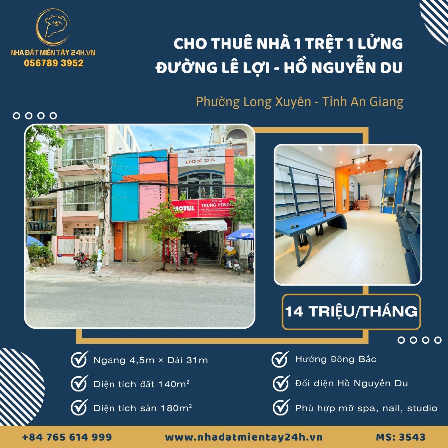 📣📣 CHO THUÊ NHÀ PHỐ MẶT TIỀN ĐƯỜNG LÊ LỢI – ĐỐI DIỆN HỒ NGUYỄN DU, LONG XUYÊN, AN GIANG (MS: 3453) 📣📣