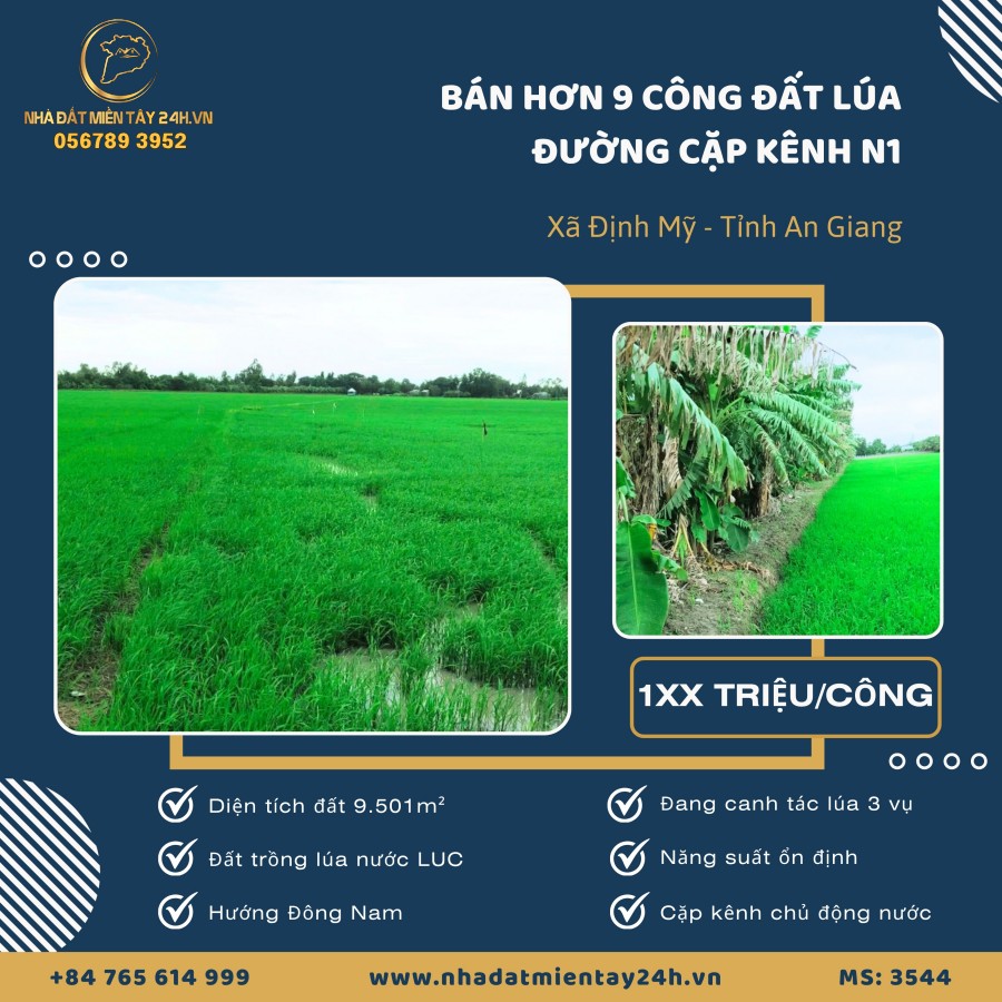 🌾 BÁN HƠN 9 CÔNG ĐẤT LÚA – MẶT TIỀN KÊNH N1, XÃ ĐỊNH MỸ, AN GIANG (MS: 3544) 🌾