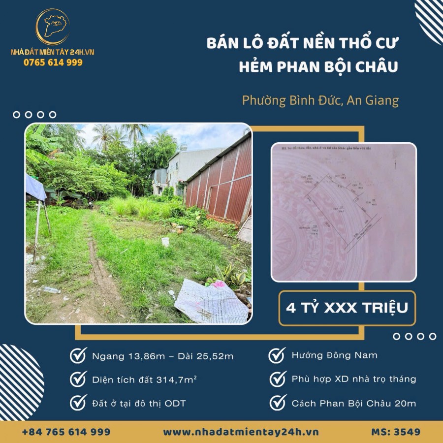 🌟 BÁN 314,7m² ĐẤT NỀN THỔ CƯ – PHƯỜNG BÌNH ĐỨC, AN GIANG (MS: 3549) 🌟