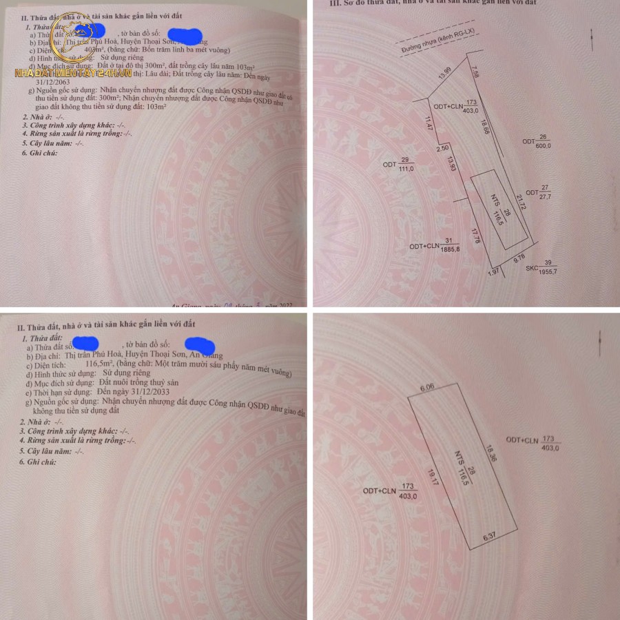 - Diện tích đất: 519,5 (ODT 300; CLN 103; NTS 116,5) m2