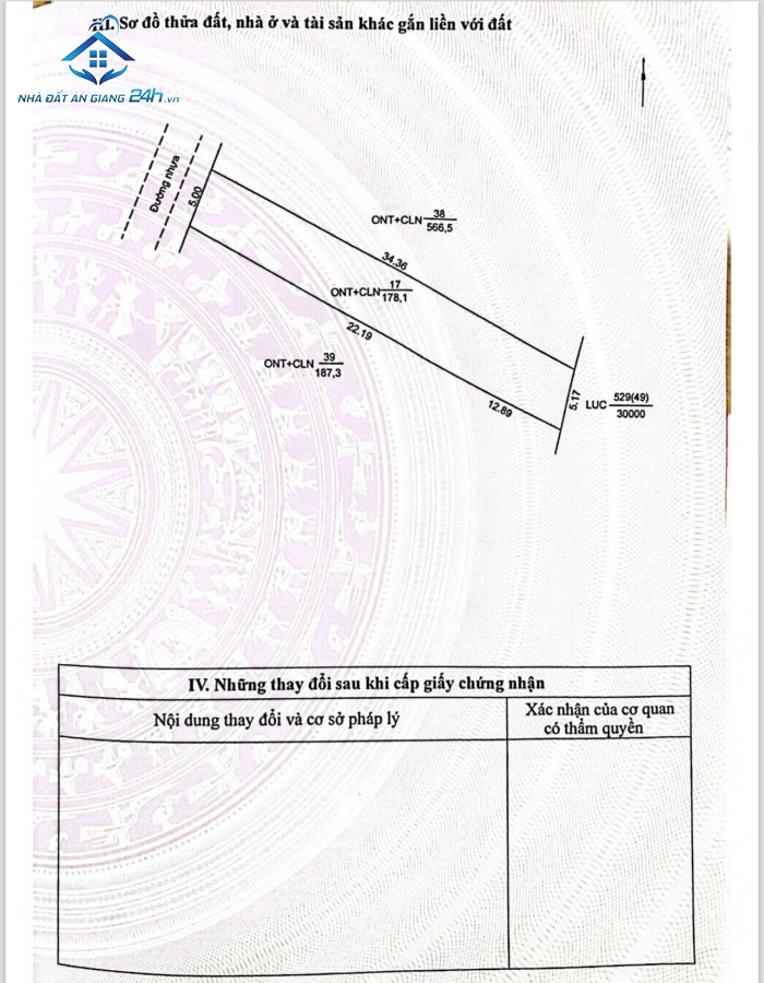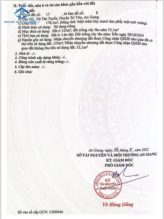 - Mục đích sử dụng đất: Đất thổ cư tại nông thôn ONT 125m2; Đất trồng cây lâu nam CLN 53,1m2)