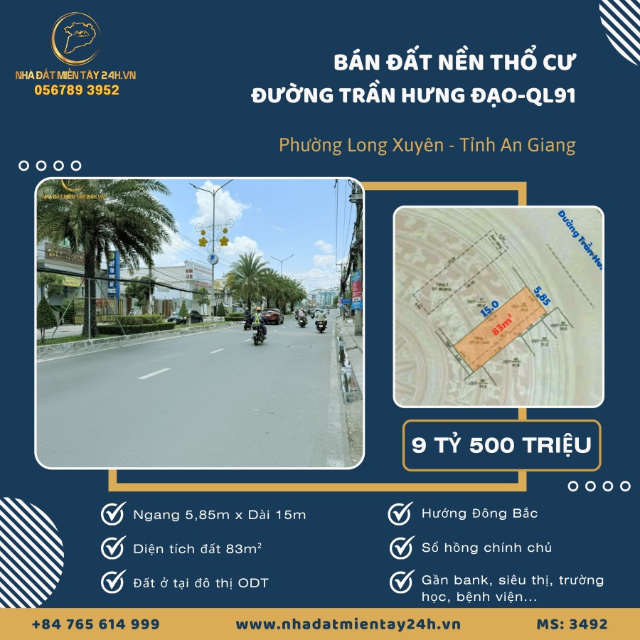 🌟 BÁN NỀN THỔ CƯ MẶT TIỀN ĐƯỜNG TRẦN HƯNG ĐẠO (QUỐC LỘ 91), PHƯỜNG LONG XUYÊN, AN GIANG - CÁCH ĐÈN 4 NGỌN 500M (MS: 3492) 🌟